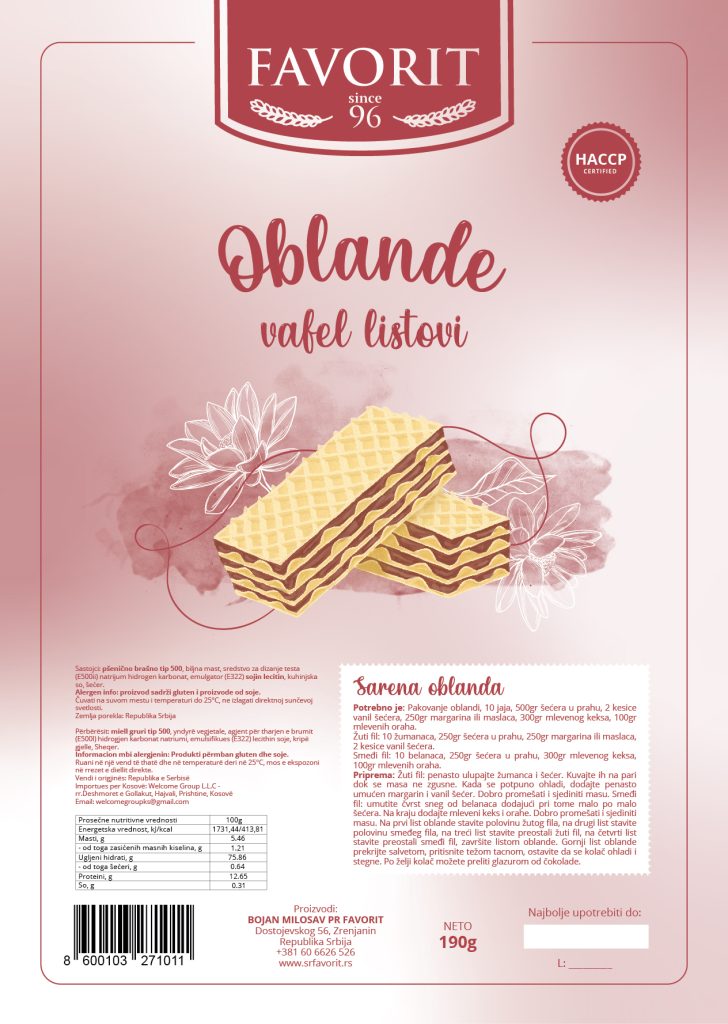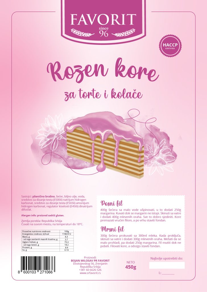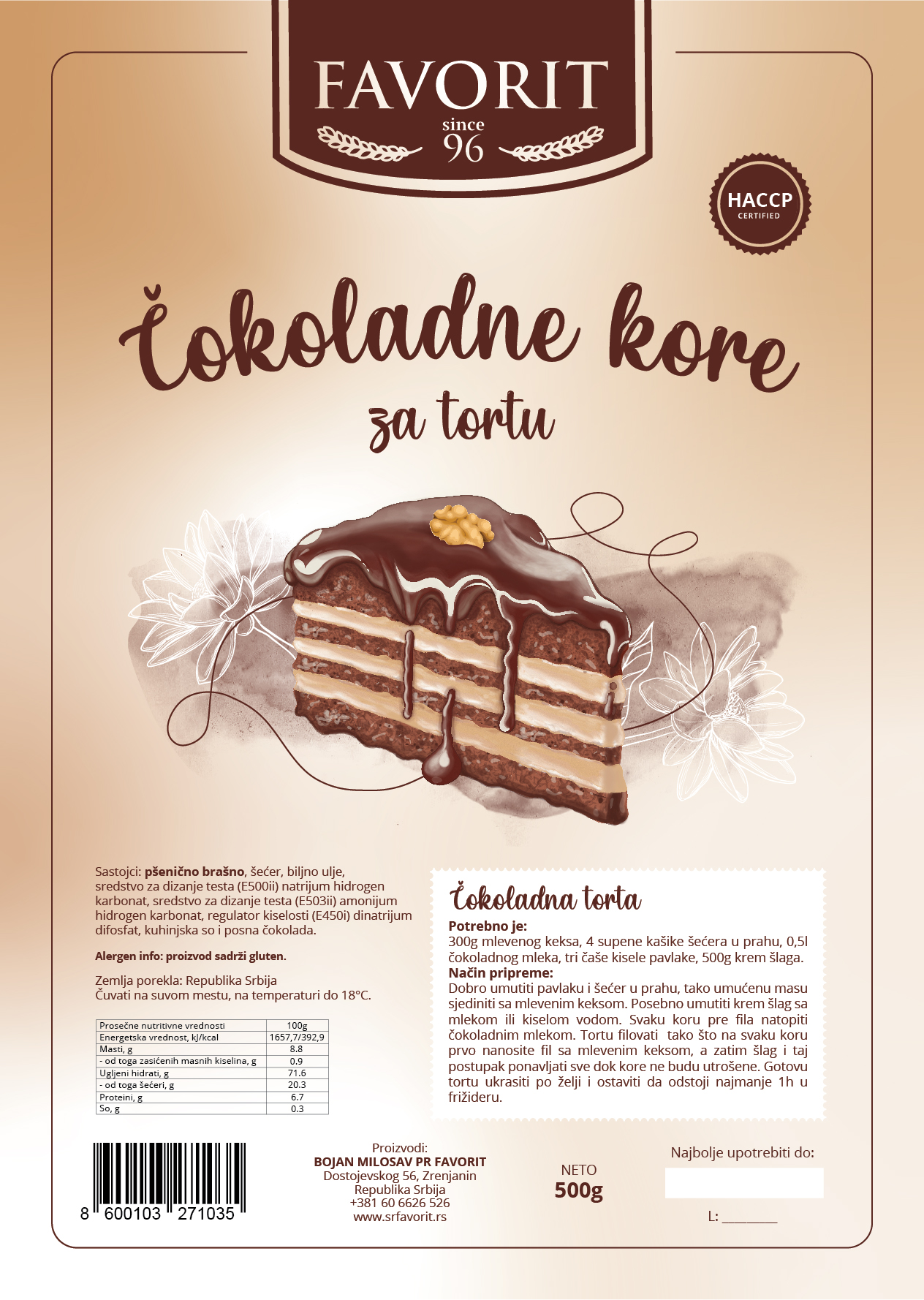 SR Favorit je preduzetnička radnja osnovana 1996. godine, kao vizija osnivača Milosav Duška i jedna smo od najstarijih fabrika za proizvodnju oblandi i kora za torte i kolače u našoj zemlji.